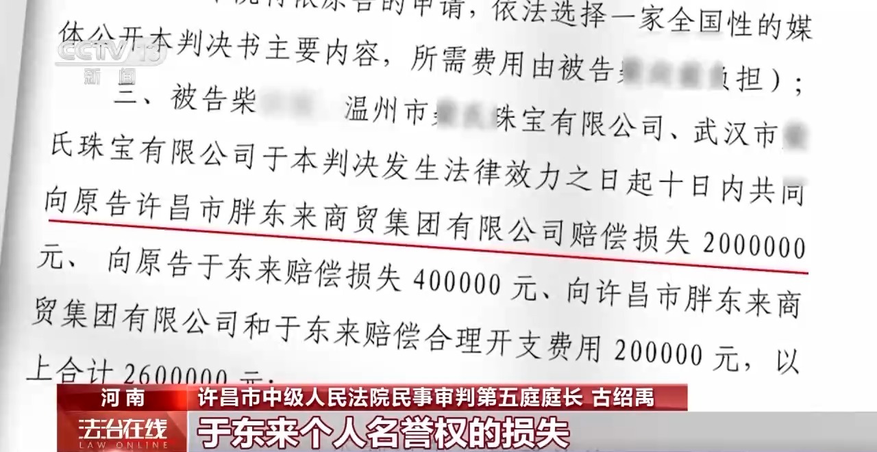 许昌市中级人民法院民事审判第五庭庭长 古绍禹:最后我们经过依法审理,认定他构成商业诋毁和侵权,并根据侵权的传播范围、侵权造成的损害、他的主观恶意程度等各种因素的综合,商业诋毁我们判赔数额判了200万,于东来个人名誉权的损失,我们判赔的数额是40万,必要的费用是20万。