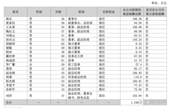 2024年年报显示,公司董事、监事和高级管理人员2024年报酬总额1,540.3万元。董事长杨乐2024年从公司获得的税前报酬总额为198.38万元,在公司关联方获取报酬。董事、副总经理孙庆元2024年从公司获得的税前报酬总额为140.23万元,未在公司关联方获取报酬。副总经理、董事会秘书、财务总监刘洋2024年从公司获得的税前报酬总额为103.94万元,未在公司关联方获取报酬。