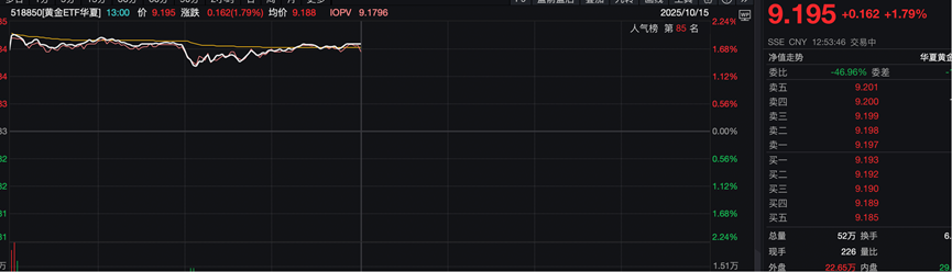 比如挂钩实物金价的黄金ETF华夏(518850),就呈现了和黄金价格类似的走势,持续新高。截至10月15日中午收盘上涨1.79%,单位净值为9.195元,年内涨幅超50%。